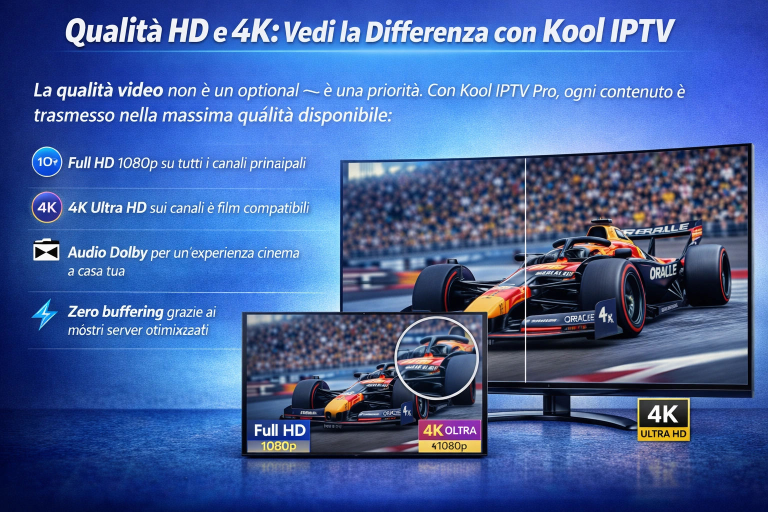 La qualità video non è un optional — è una priorità. Con Kool IPTV Pro, ogni contenuto è trasmesso nella massima qualità disponibile: